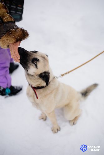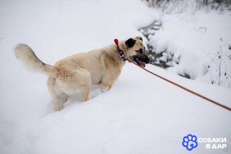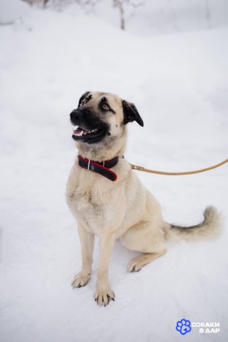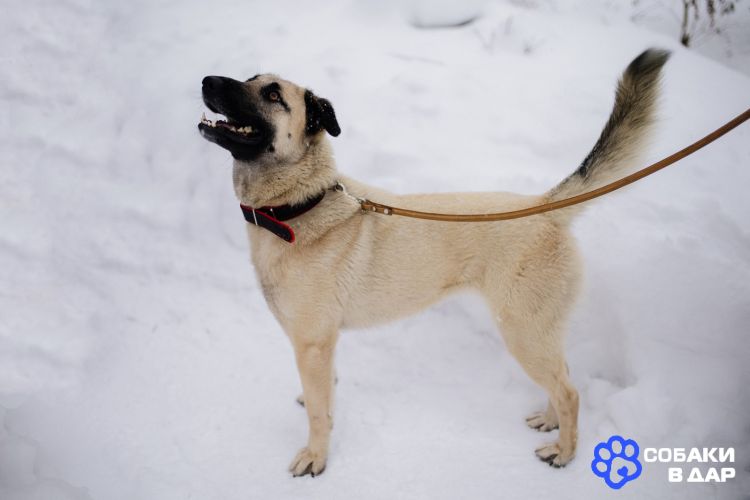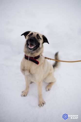 Рост до колена, вес примерно 15-18 кг. Пристраивается в добрые руки с ненавязчивым отслеживанием судьбы, строго не на цепь.